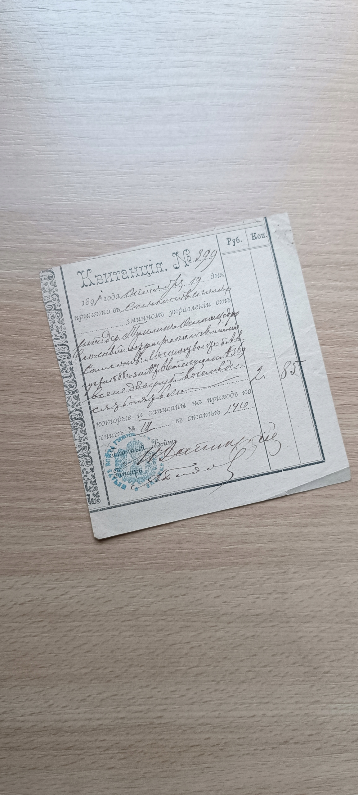 Kwit carski #399 (1891 rok)