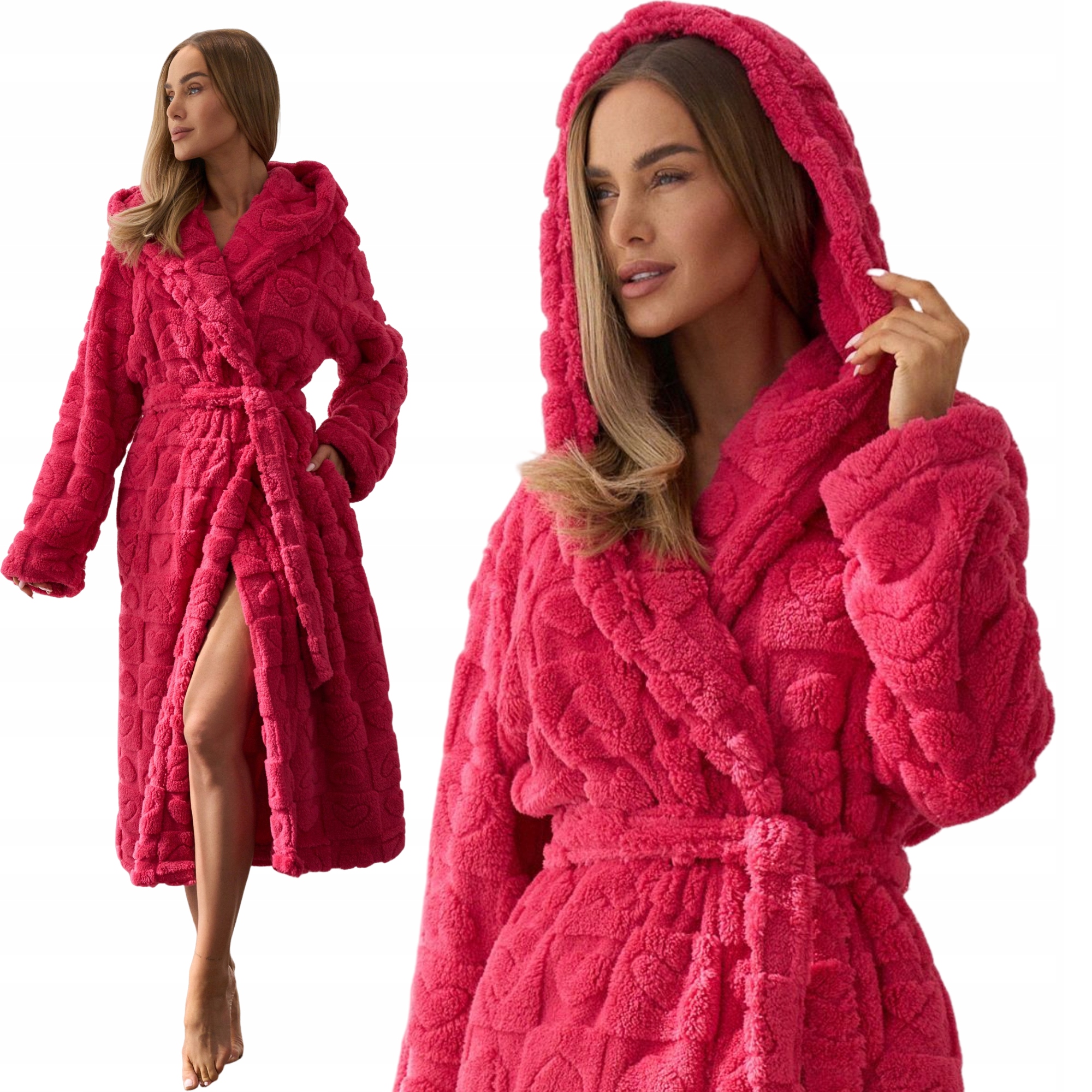 ТЕПЛИЙ ДОВГИЙ ХАЛАТ L&L З КАПЮШОНОМ І КИШЕНЯМИ З СЕРДЕЧКАМИ МАЛИНОВИЙ M