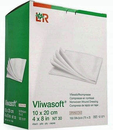 L&R - Vliwasoft 10 х 20 см, 150 шт. це стерильні, економічні 4-шарові компреси з абсорбуючого флізеліну. Безворсовий нетканий матеріал добре вбирає та має низьку схильність до прилипання.