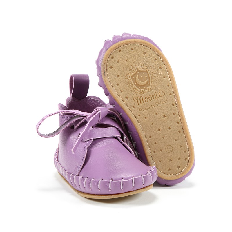 Лінія Moonie's - це прорив у безпеці дитячої стопи, що розвивається. Взуття виготовлено з натуральної козячої шкіри, яка використовується для виробництва елітної шкіргалантереї. Цільнозерниста козяча шкіра водночас м’яка та довговічна. Він не містить хрому - хром є токсичним і канцерогенним елементом, який проникає в шкіру. Для фарбування анілінової шкіри використовують тільки рослинні барвники, які не закривають пори. Високий ступінь повітропроникності забезпечує дихання шкіри дитини. Унікальна підошва Moonie's First Step виготовлена з гнучкого термокаучуку з чарівним ароматом шоколаду (запах зберігається на весь час використання!) Підошва прошита (а не проклеєна), а взуття оброблено ручною мокасиновою строчкою.