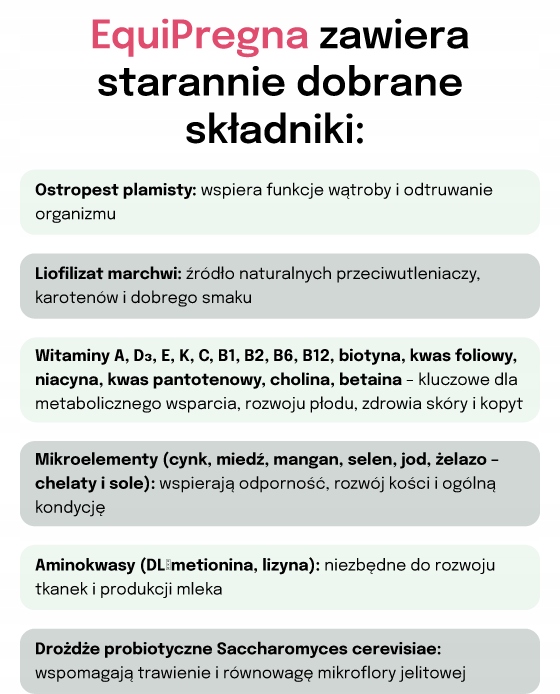 Impavergna - це спеціалізована комплементарна суміш корму, створена ветеринари для вагітної та годуючої кобили. Продукт забезпечує ключові вітаміни, мікроелементи, амінокислоти та цінні рослинні екстракти, що підтримує належний перебіг вагітності, здоров'я плода та вироблення молока.