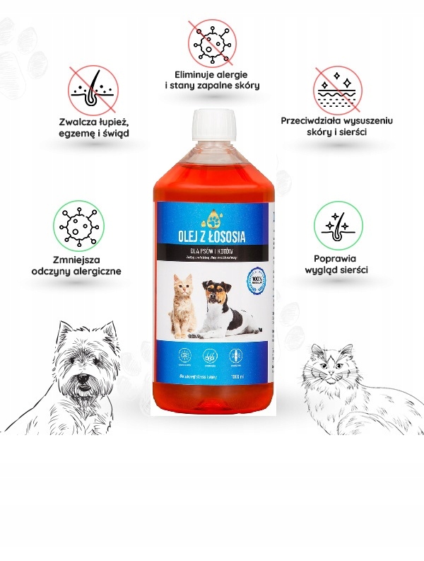Олія лосося для собак і котів будь-якого розміру та віку. Цінне джерело жирних кислот Омега 3 і Омега 6. Благотворно впливає на шкіру і шерсть тварин. Холодного віджиму зі 100% атлантичного лосося. Польський продукт