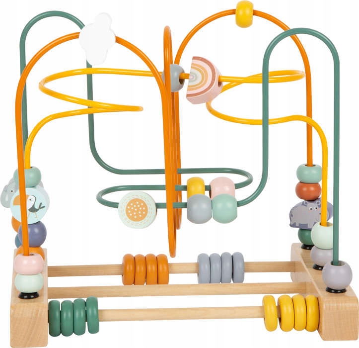 Лабіринт переплетення з барвистими кульками для ковзання в різних напрямках у дерев’яній основі. Діти можуть рухати дерев’яними елементами на тичинках та дерев’яних тварин на вирізаних маршрутах.