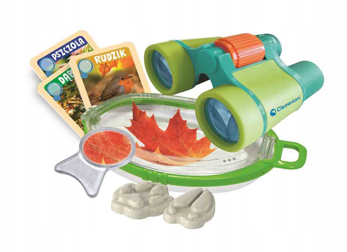 Бінокль, контейнер для спостереження за черв'яками, лупа, гіпсові форми для відтворення слідів тварин, картки з великою кількістю інформації про природу.