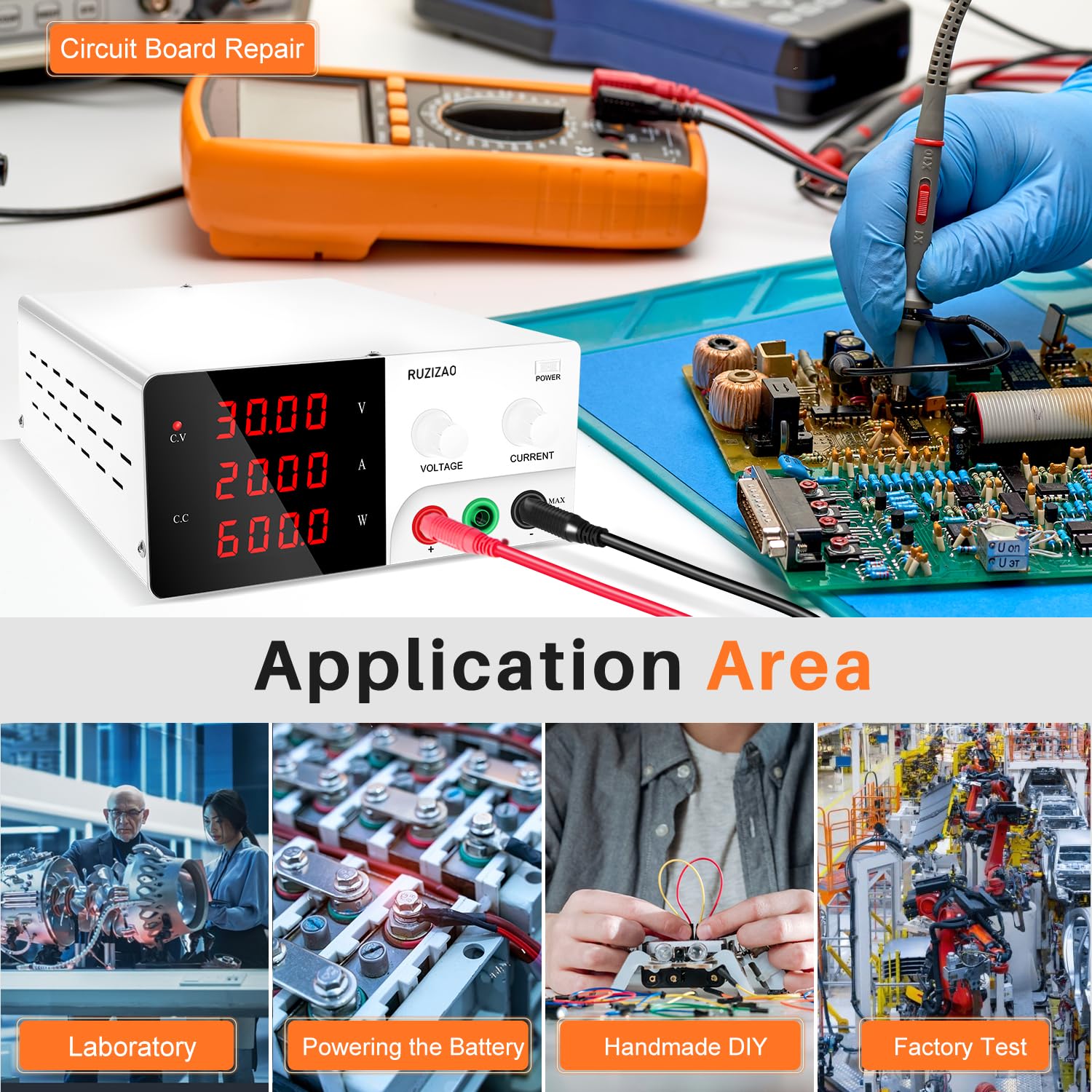 - Стабільна вихідна потужність, Автоматичне перемикання режиму CC/CV: 30 В 20A Лабораторне джерело живлення -це професійний пристрій контролю високої резолюції 0,01 В та 0,001A, які можуть тривалий час працювати під повним навантаженням. Режим постійного струму та постійного струму можна автоматично перемикатися. 4-значний світлодіодний дисплей підсвічування забезпечує більш точне відображення напруги та струму, що добре видно навіть при слабкому освітленні.