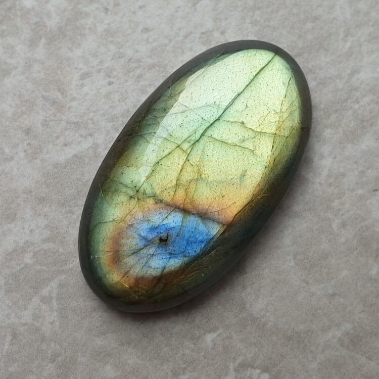 Лабрадорити характеризуються тим, що що їх світіння виходить залежно від кута падіння світла. На фотографіях показано конкретний пропонований лабрадорит. Купуючи ви отримуєте саме цей кабошон.