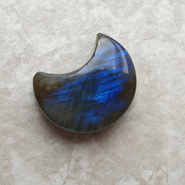 Лабрадорит у формі місяця, полірований з плоским дном. Мінерал, який можна використовувати в цікавих дизайнах ювелірних виробів.