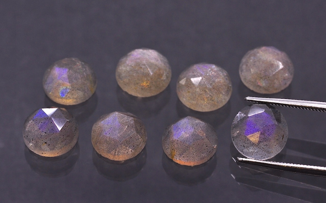 Тип каменю: Лабрадорит/польовий шпат колір: сірий з фіолетовим відблиском Розміри: 8 мм товщина: 4,5 мм форма: круглий Тип крою: гранчаста розетка Вага в каратах: 1.75 Походження сировини: Мадагаскар Лікування: невиправлений Чистота: напівпрозорий