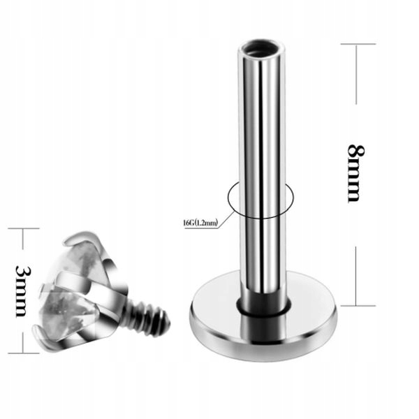 - 16 г (1,2 мм); куля, фіаніт - розмір: 3 мм; довжина стрижня: 8 мм.