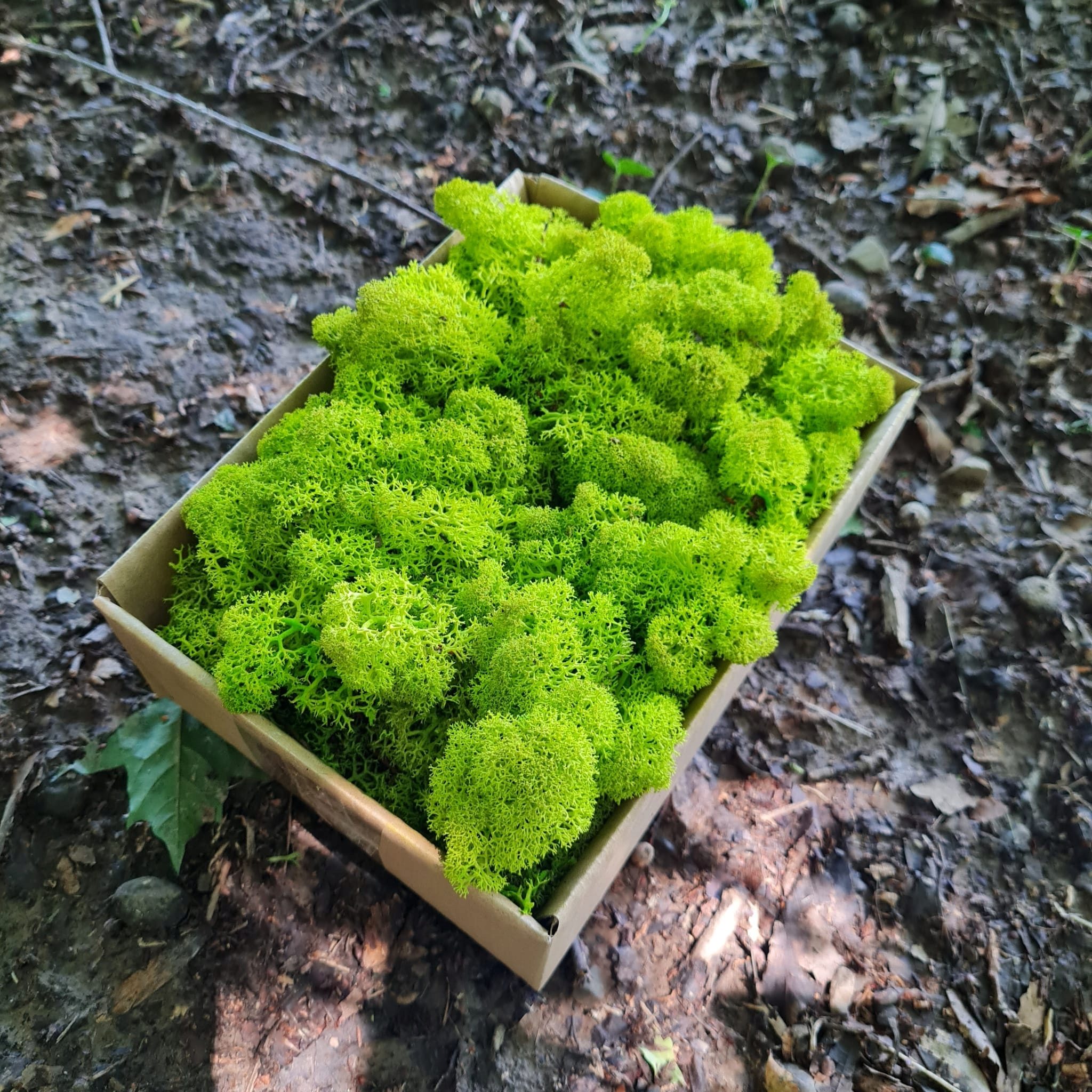 Natural Reindeer moss - мох, походить зі Скандинавії, колір моху отримують з природних барвників. Мох був підготовлений, цей процес дозволяє моху залишатися у своїй природній структурі протягом багатьох років. Завдяки процесу приготування він м'який на дотик протягом багатьох років і зберігає свою свіжість.