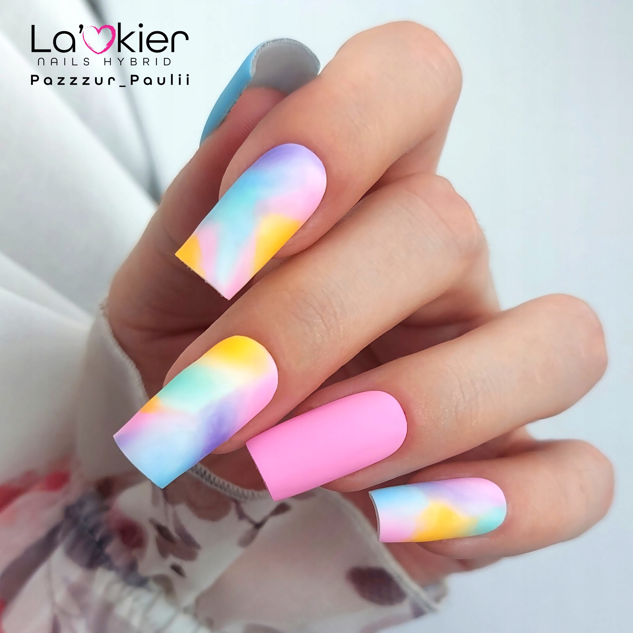 - Нанесіть тонкий шар кольорового гібридного лаку на попередньо нанесену та затверділу основу, а потім зафіксуйте за допомогою УФ/LED лампи.