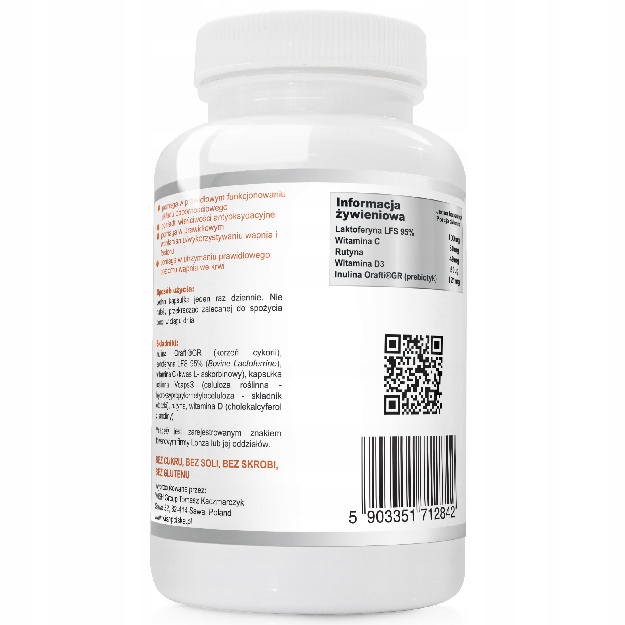 СКЛАД: інулін Orafti®GR (корінь цикорію), LFS лактоферин 95% (бичачий лактоферрин), вітамін C L- аскорбінова кислота), рослинна капсула Vcaps® (гідроксипропілметилцелюлоза - компонент оболонки), рутин, вітамін D (холекальциферол з ланоліну)