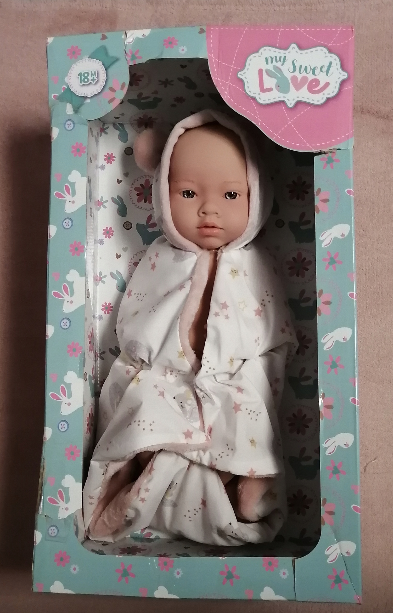 Lalka bobas prawdziwa dziewczynka w kocyku, zapach wanilii 33 cm