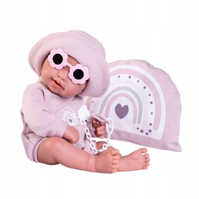 Іспанська лялька з милими рисами обличчя одягнена вбузкові комбінезониз кольоровою райдужною аплікацією. Коли дівчина хоче відпочити, лягає на свою райдужну подушку, яка відповідає малюнку на її одязі. У нього на голові капелюх, що теж сенсація. Аксесуари, що входять до Pipa, дозволять вам ще більше втілити себе в роль молодої мами.