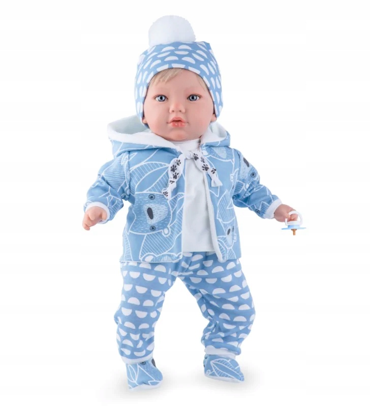 ❤️На хлопчику спортивний комплект. Вбрання складається з синіх спортивних штанів з білим візерунком і худі, прикрашеного мотивом ведмедика. Вбрання доповнено білою футболкою, тканинними туфлями та білою соскою з кулоном msia. Весь набір можна зняти з ляльки, тож переодяганню не буде кінця.