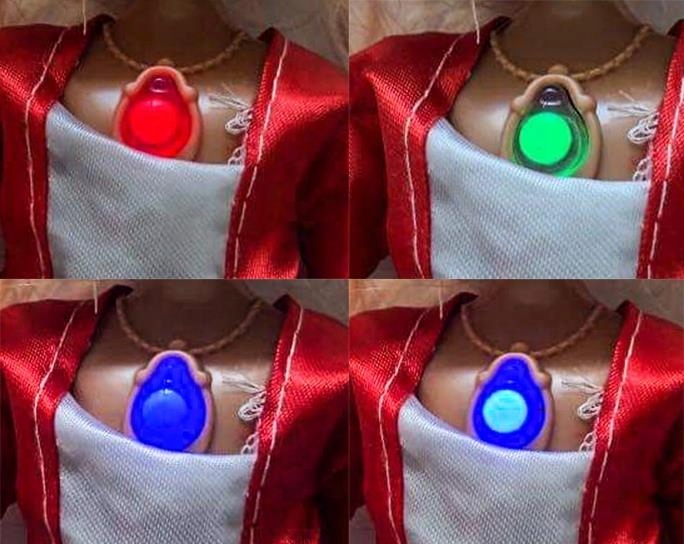 Лялька має унікальний кулон, який при натисканні починає світитися, а лялька починає співати