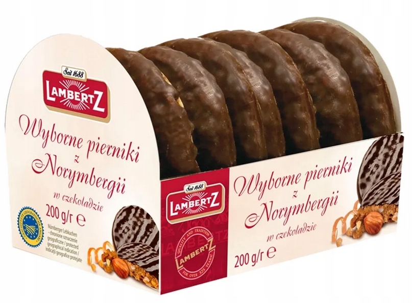 Чудові пряники з Нюрнберга, покриті 12% високоякісним шоколадом. Вони містять 7% суміші різних горіхів і цедри солодкого апельсина. Ідеальний варіант для кожного гурмана! Продукт має захищене географічне зазначення.