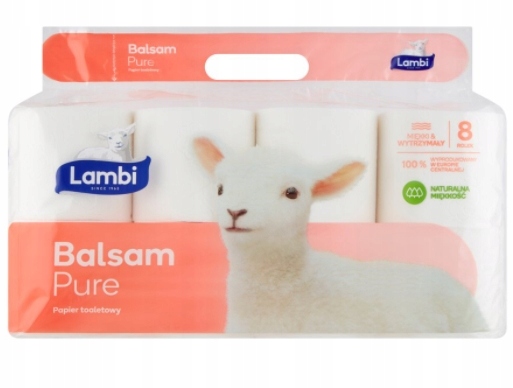 Lambi Balsam Pure - м'який туалетний папір з додаванням ніжного бальзаму, без ароматизаторів. Продукт пройшов дерматологічне тестування. Ідеально підходить навіть для найвимогливішої шкіри.