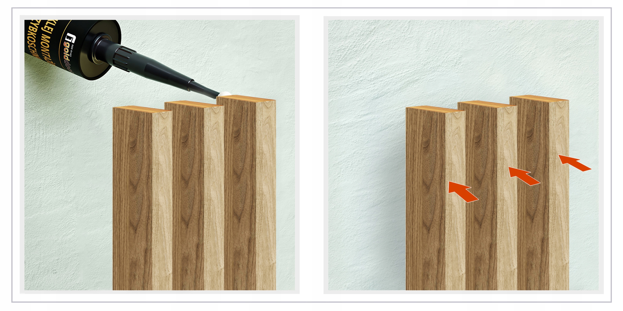 4. Прикріпіть планки до стіни. Використовуючи іншу планку, можна відзначити відстань 1,6 см для установки наступної планки.