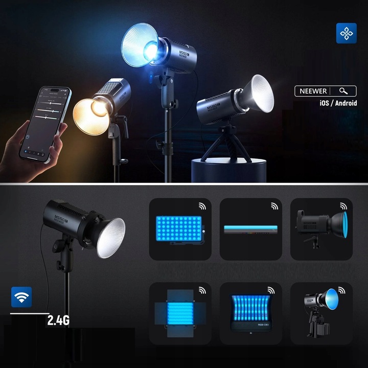 LAMP Neewer MS150B можна керувати бездротовим шляхом, використовуючи мобільний додаток "Neewer-Shutter", який дозволяє легко робити зображення та записувати фільми, не торкаючись лампи.