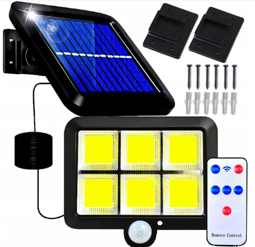 Ефективна сонячна лампа з до 120 світлодіодами COB із прикріпленою сонячною панеллю це невичерпне джерело безкоштовної енергії для вашого будинку. Встановіть будь-де - сонячну панель можна повісити в радіусі 5 метрів від світильника (це довжина кабелю, що з'єднує обидва модулі). Зменште витрати на зовнішнє освітлення та зосередьтеся на екології – не потрібно міняти батарейки чи часто міняти лампочки. Світлодіоди COB мають термін служби до 35 000 годин