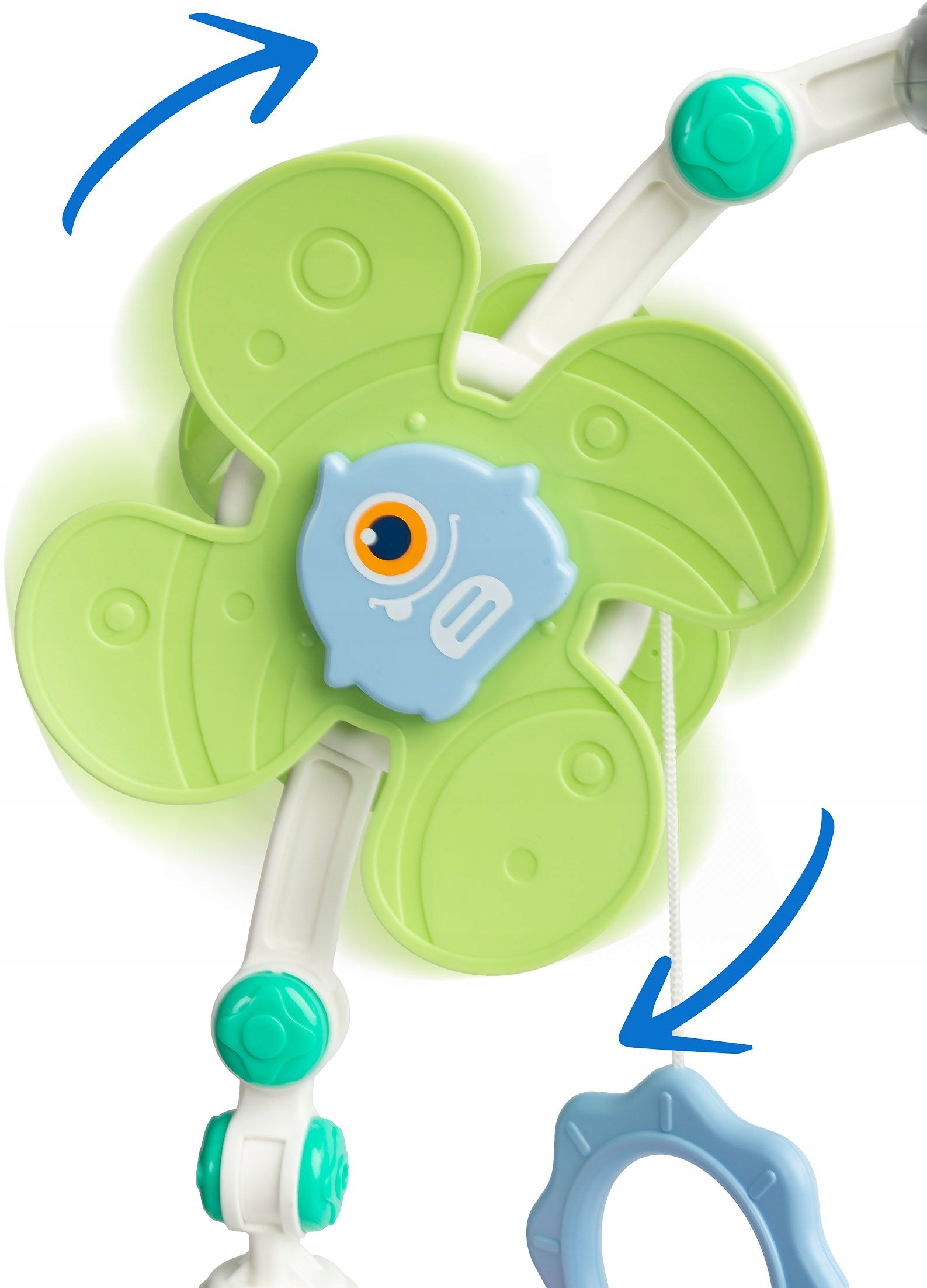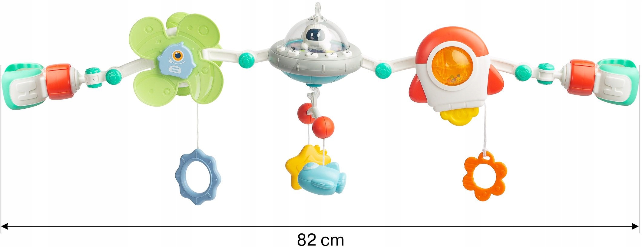 У ньому є різноманітні іграшки, розроблені для розвитку рухів дитини та цікавості. Це примітно до акумуляторів сяюча музична панель з поворотною каруселею, яка, граючи ніжні мелодії, допоможе спати. Завдяки гнучкому та згинанню кріплення та знімків, блукаючі космос можна легко підвішувати або прикріпити не тільки до дитячої коляски, але і майже в будь -якому місці (автокрісло, рокер, шпилька, стілець для годування або ліжка).