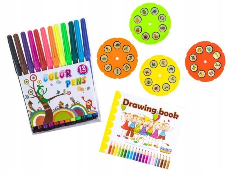 4 тематичні взаємозамінні диски містять до 32 малюнків для копіювання. Диски розділені за тематикою, завдяки чому дитина дізнається про нових тварин, морських тварин, фрукти та транспортні засоби. Ваш малюк зможе малювати нові малюнки 12 різними кольоровими фломастерами або власними олівцями. Фломастери, що входять до набору, легко змиваються з тіла.