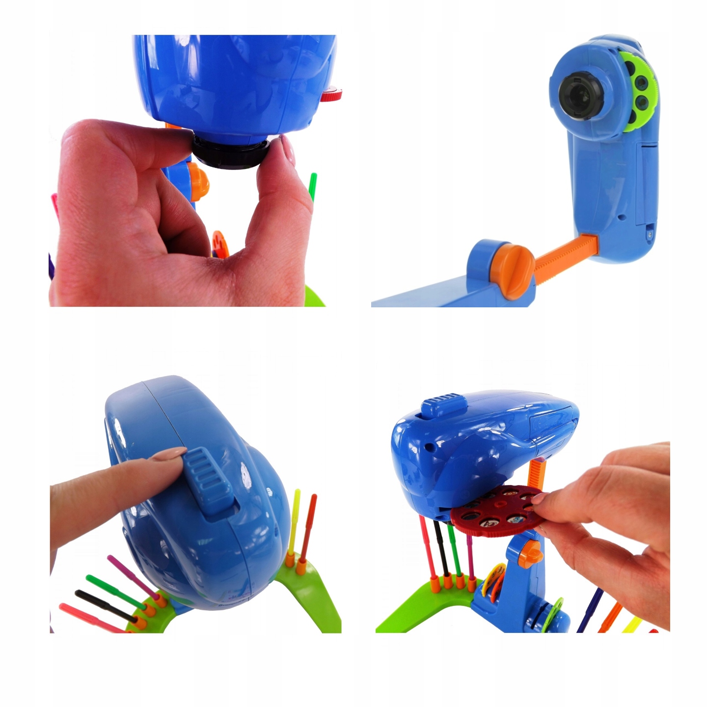 Проектор для навчання малюванню дуже простий у використанні. Є перемикач для включення, потрібні 3 батарейки. Він регулюється по висоті за допомогою ручки, що полегшує малювання. Диск із зображеннями слід розмістити збоку від проектора. Після ввімкнення з'явиться зображення, щоб змінити його, перемістіть диск на одну точку вправо або вліво. Ми також використовуємо ручку для налаштування розміру відображуваного візерунка. Додаткові диски можна зберігати у спеціальних відсіках. Корпус проектора також має відділення для фломастерів, що означає, що вони завжди під рукою у дитини.