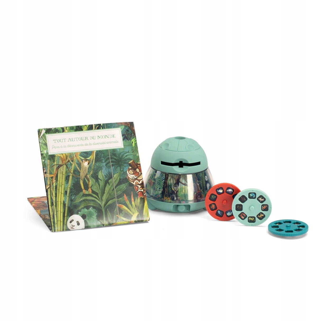 Ми знайомимося з тваринами світу завдяки лампі для проектора від Мулен Роті! У набір входять 3 диски зі слайдами (по 8 на одному), які потрібно помістити в лампу і навести зображення на гладку стіну в темній кімнаті. Тварини на землі, у воді та в небі чекають, щоб їх відкрили!
