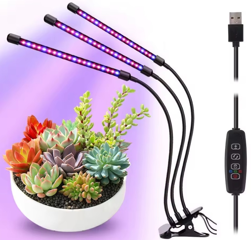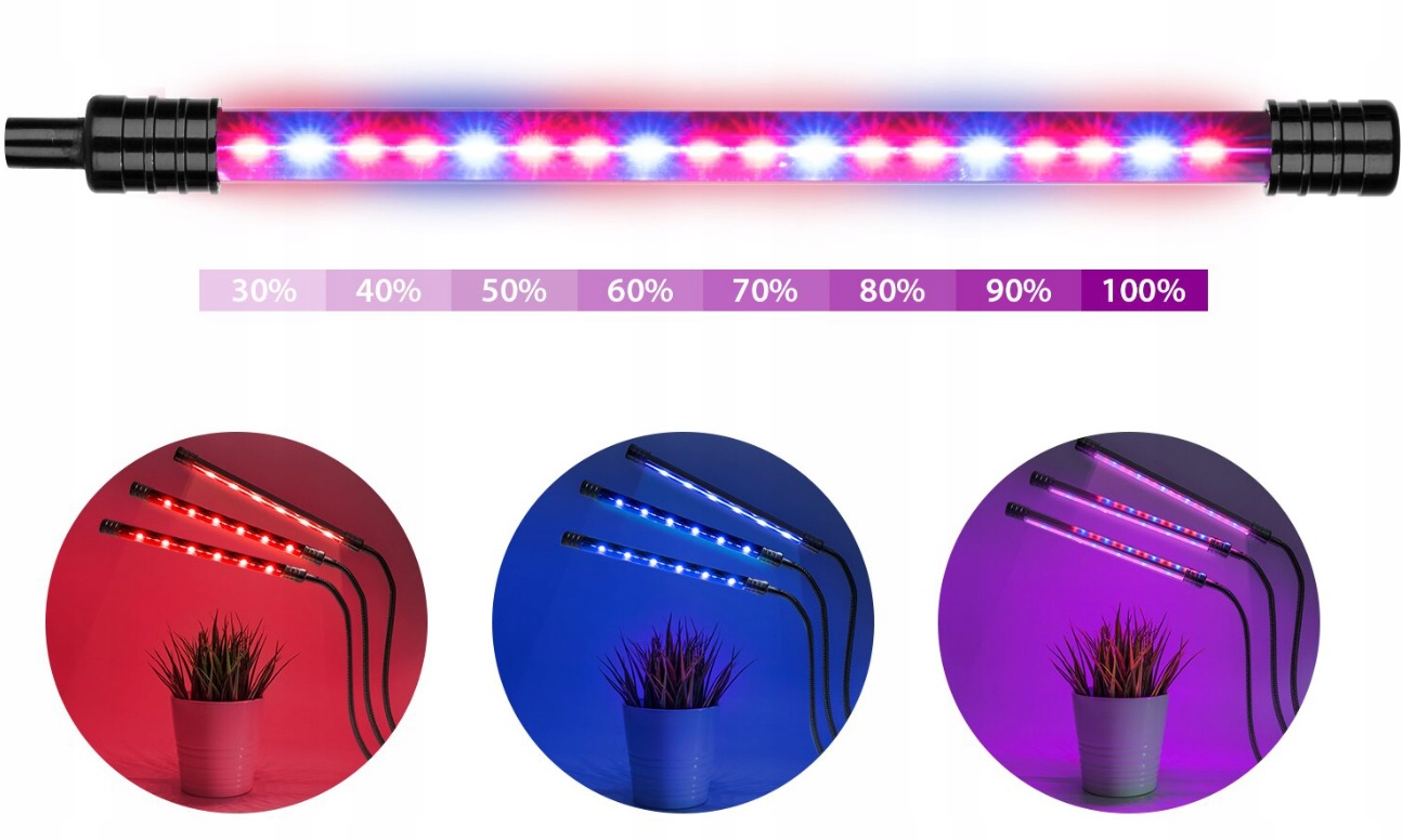 Спеціальна лампа для підтримки росту та розмноження рослин, оснащена стрічкою червоних і синіх світлодіодів загальною потужністю 20 Вт генерує три типи світлових хвиль: червоні, сині та фіолетові різної довжини.