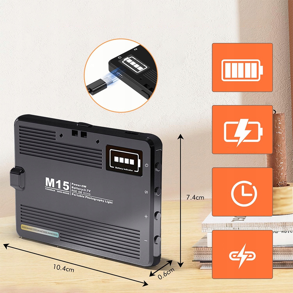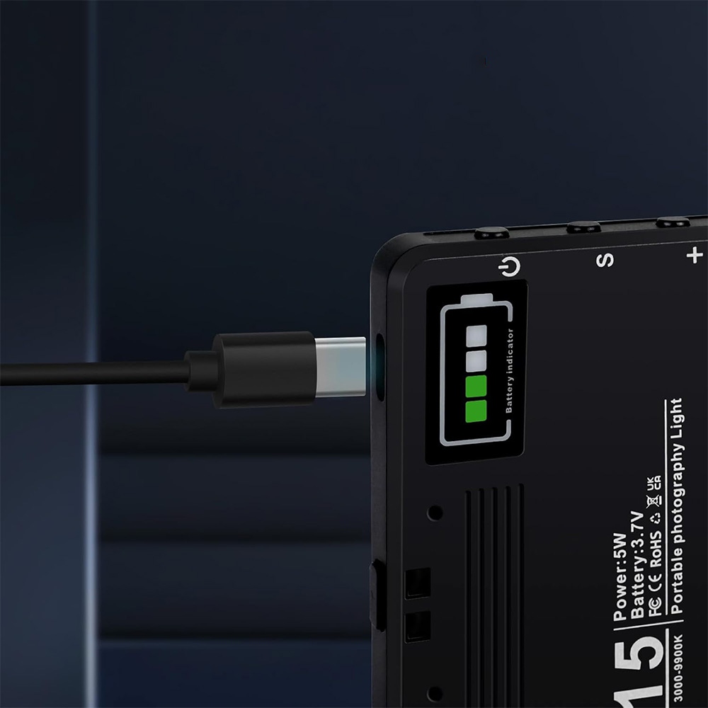 Ця портативна лампа камери має вбудовану літієву батарею 1500 мАг, а лампа мобільного телефону може використовуватися постійно протягом 3-8 годин. На звороті є індикатор акумулятора, тому ви можете в будь -який час перевірити рівень заряду акумулятора. Підтримує порт зарядки типу C і може використовуватися під час зарядки