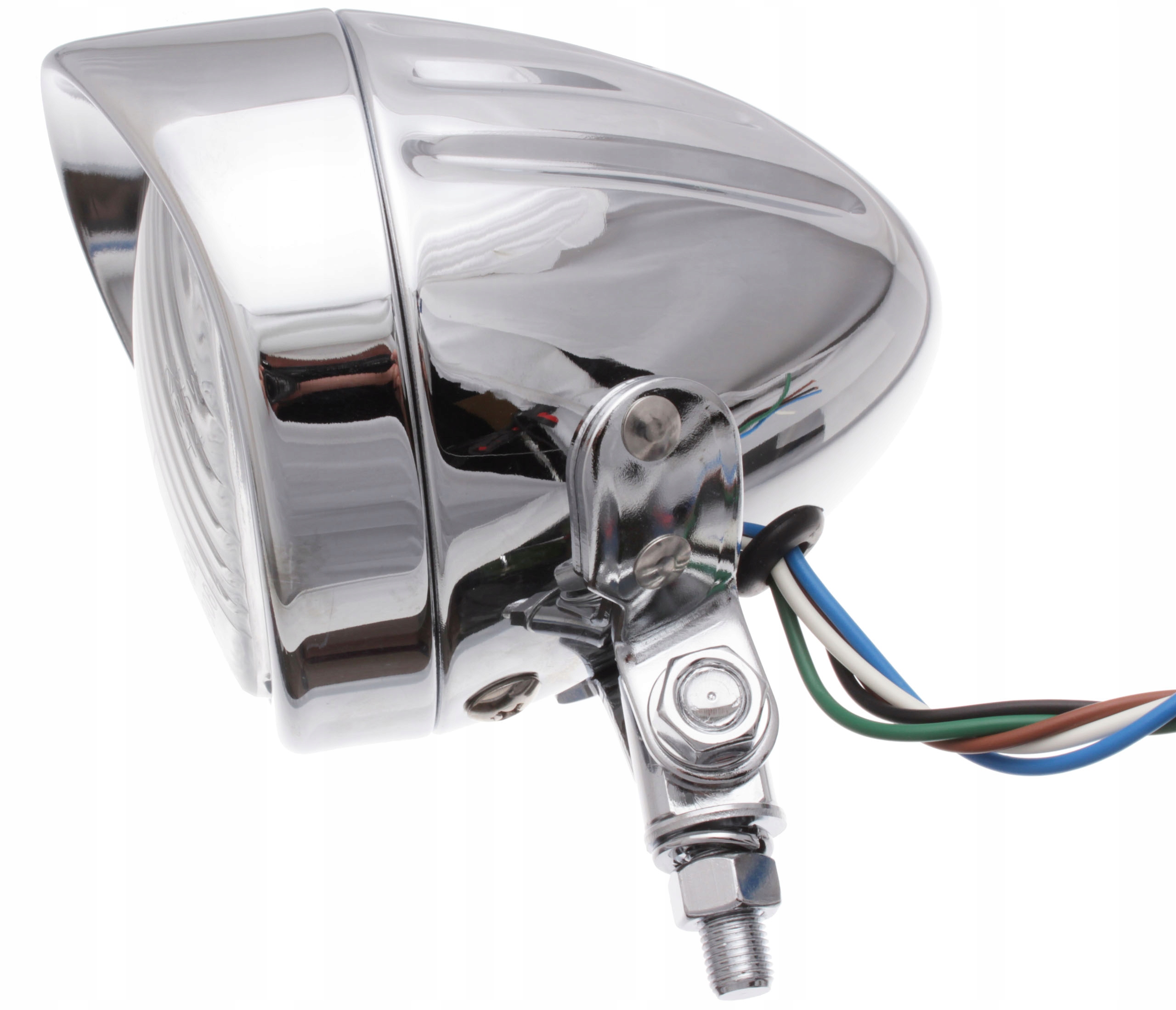 Опис: Лайтбар 4 дюйма, передня мотоциклська лампа з дахом електронної марки. Лампочка H4 12V 60/55W. Корпус лампи має стильний тиснення, виготовлений з металу, хрому, смугастого скла фари. Регульоване кріплення. Його можна використовувати як основну лампу або як лампа лампи. Він має лампочку для паркування W5W та європейське затвердження E4.