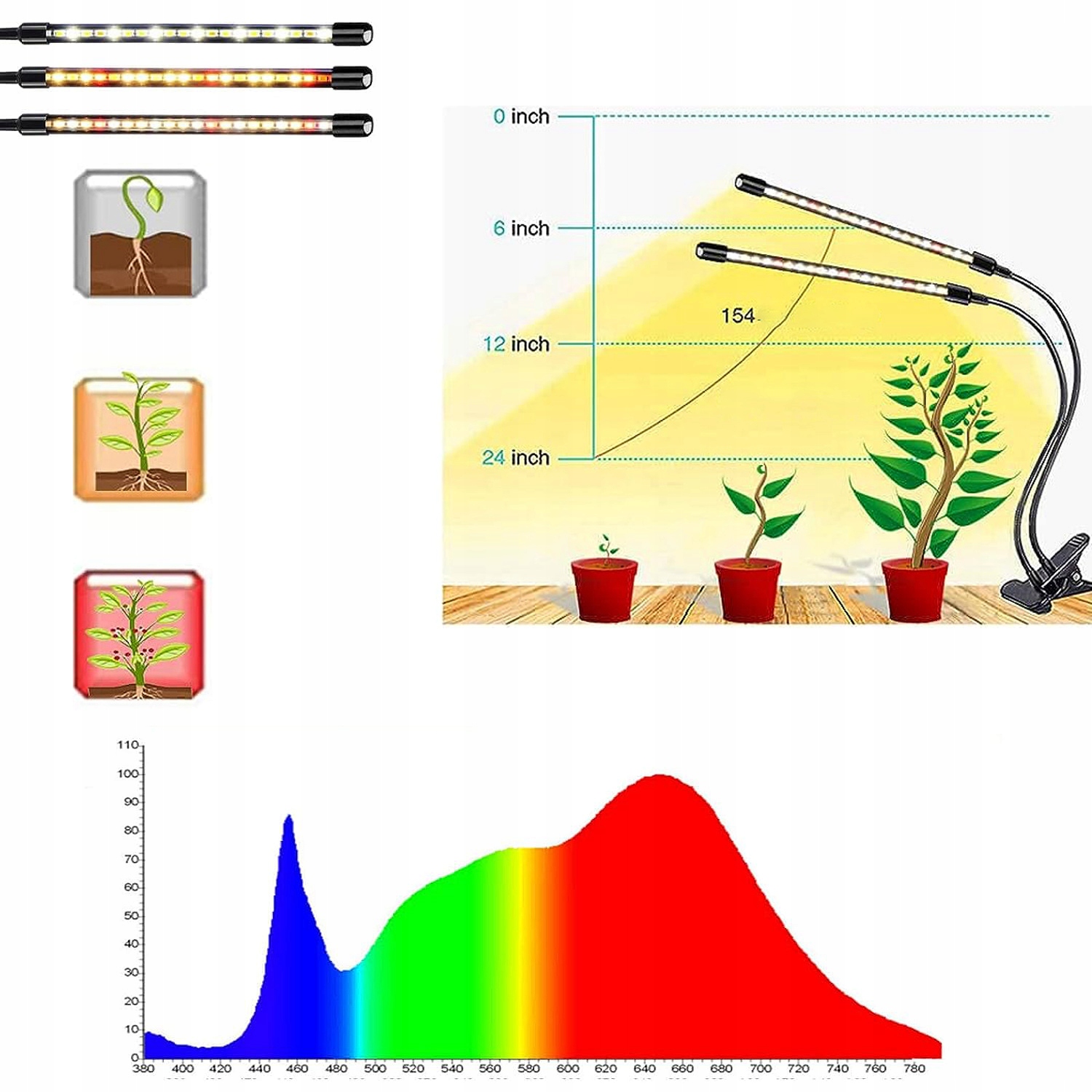 🌟 -З теплим світлом 3000 К, білим світлом 5000 К і світлодіодними намистинками червоного світла 660 нм.Весь спектр близько до природного сонячного світла та підходить для рослин у горщиках на всіх стадіях росту.