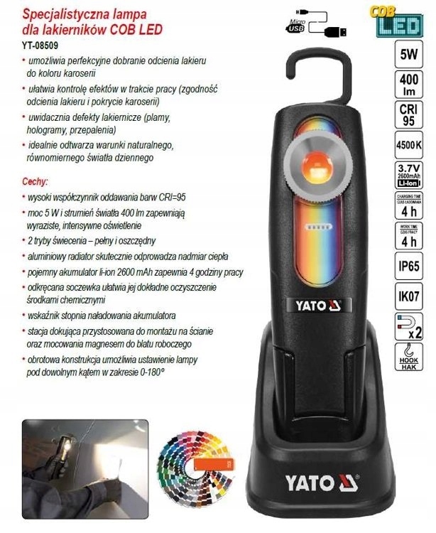 Сучасне світлодіодне джерело COB з дуже високою Індекс передачі кольору CRI = 95, аналогічний сонячному світлу, дозволяє ідеально підібрати потрібний колір і відтінок лаку, серед інших. автомобіля.