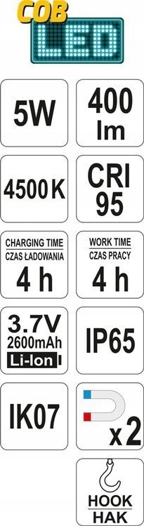 - Ефективне світлодіодне джерело COB також забезпечує світловий потік до 400 лм, що є унікальним серед звичайних акумуляторних ламп для майстерень.