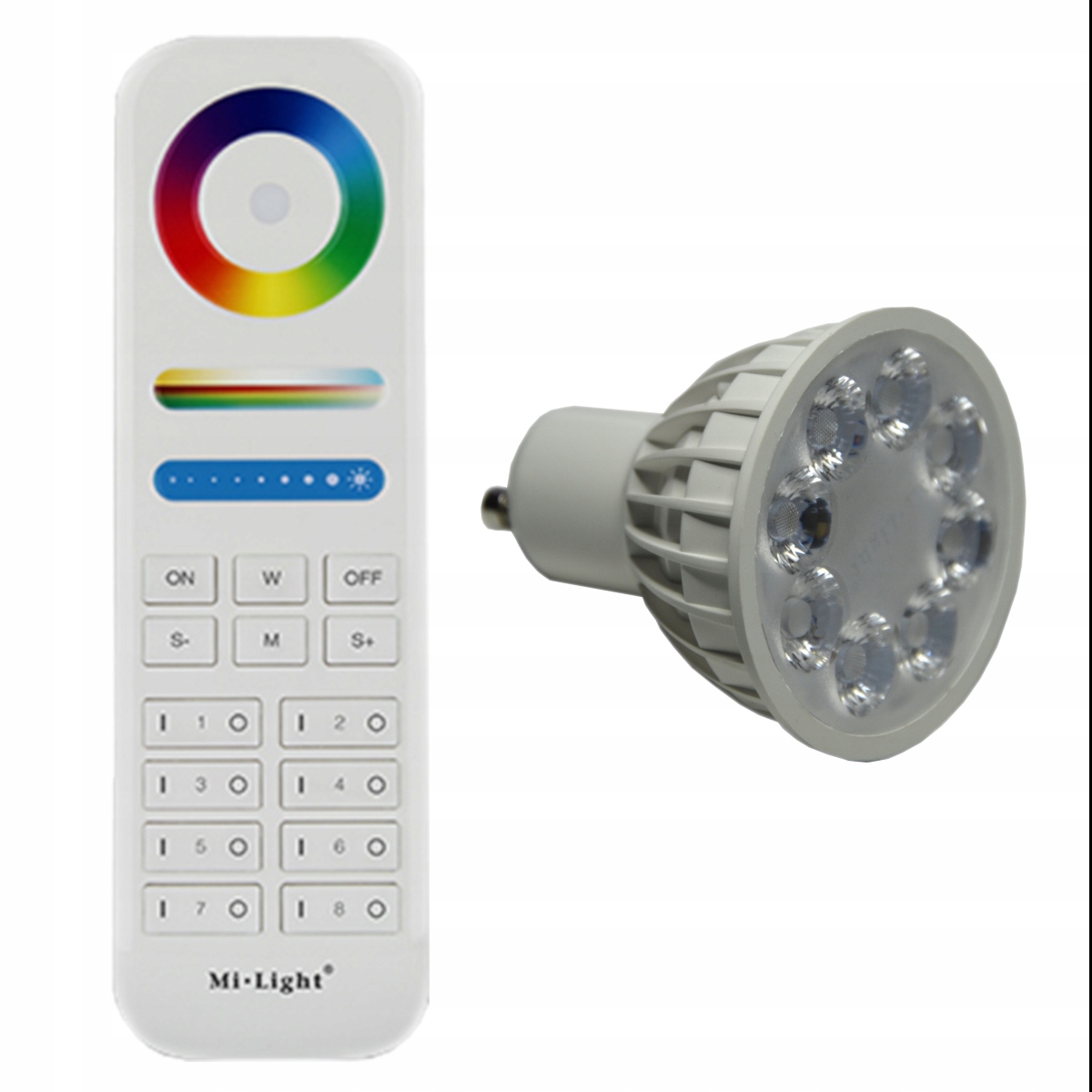 лампу SMART LED RGB+CCT WiFi GU10 230V MiLight FUT103 з можливістю відображення будь-якого кольору (доступно 16 мільйонів кольорів з палітри RGB), а також будь-якого білого світла в діапазоні 2700-6500 К, потужністю 4 Вт з тримачем GU10, керованим радіохвилями 2,4 ГГц, 8-зонним пультом MiLight FUT089.
