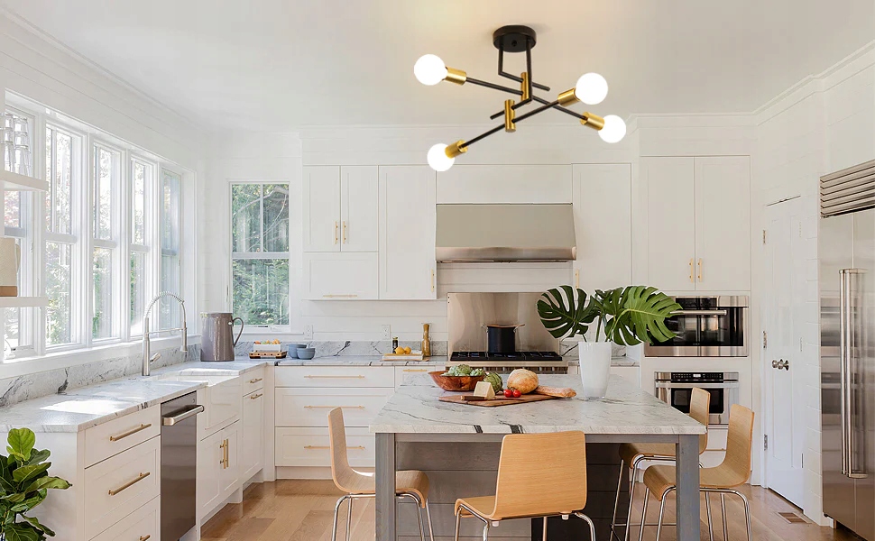 Ця стельова лампа сумісна з 4 джерелами енергії E27 (лампочки НЕ входять до комплекту). Його можна повністю затемнювати, якщо використовувати лампочку з регулюванням яскравості та вимкненим димером.
