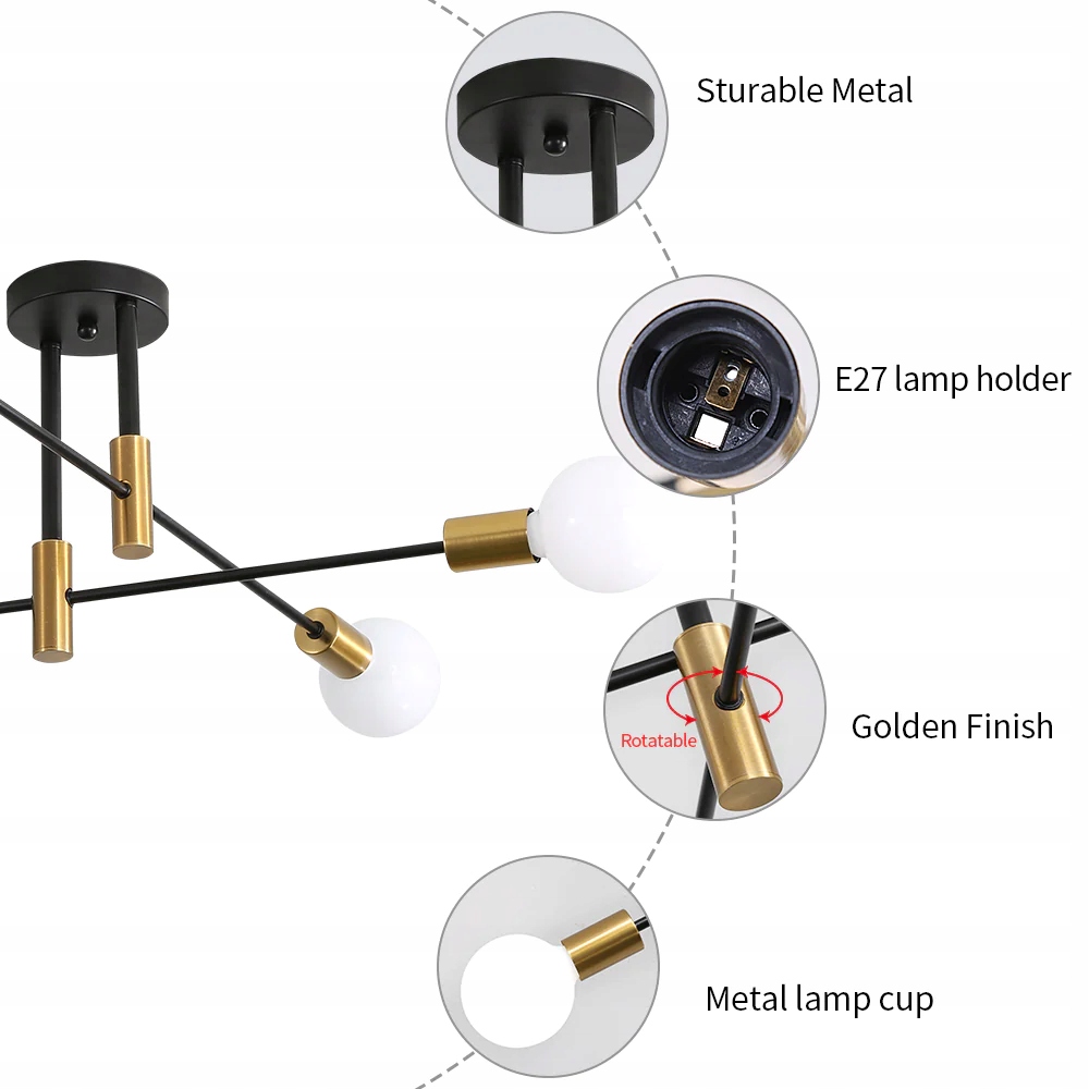 Промисловий стельовий світильник складається з металу, роз’ємів і основної батареї із золотистим виглядом, вдосконаленої версії з гальванічним покриттям, класичного чорного та золотого двоколірного вимикача та модулів у промисловому стилі. Ідеально підходить для ресторанів, віталень, барів, офісів, дитячих кімнат, кухонь, кафе, ферм та інших декоративних місць.