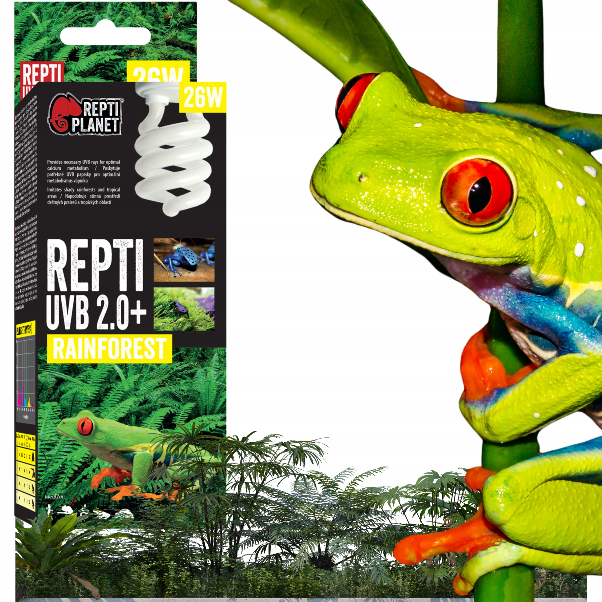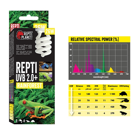 Planet repti UVB 2.0 може не випромінювати достатньо теплових променів і світла. Якщо необхідно, з’єднайте з іншими джерелами світла та тепла (наприклад, інфрачервоне тепло планети Репті, пляма денного світла, денне світло, матове денне світло, неодим, далеко інфрачервоне тепло та нічне тепло). Оптимальна інтенсивність випромінювання УФБ допомагає у перетворенні вітаміну D3, що забезпечує поглинання кальцію. УФБ -випромінювання є частиною сонячного світла, це дуже важливо для здоров'я тварин, мешканців тераріумів, оскільки це запобігає метаболічним захворюванням.
