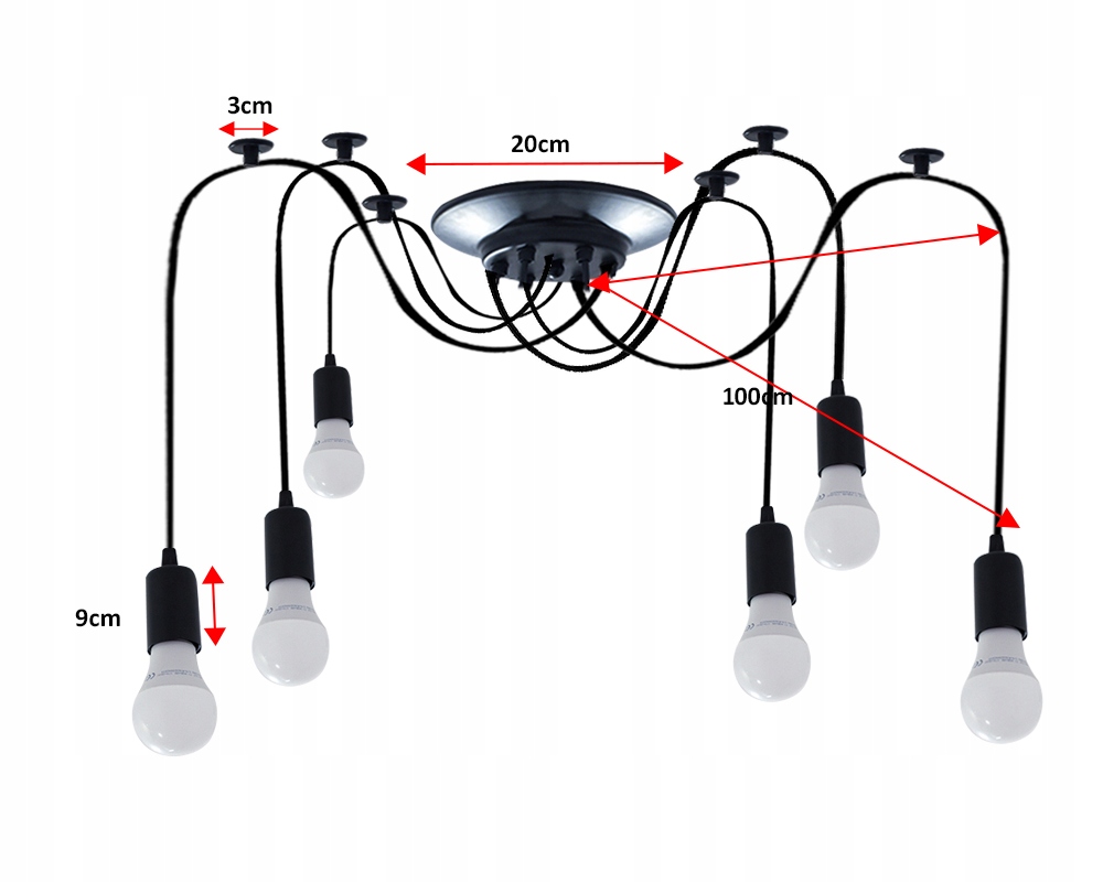Наша лампа дуже простої форми, що складається з основи з шістьма сплетеними дротами, які закінчуються патронами для лампочок, усі чорного кольору. Чудовий вибір для інтер'єрів, оформлених відповідно до сучасних тенденцій.