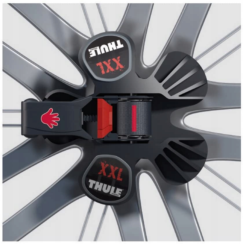 - Швидка триетапна збірка: шляхом розміщення двох пластикових робочих панелей на протекторі шини, потім затягування монтажної втулки на одній із колісних гайок/болтів, затягування важеля за допомогою храповий механізм. Автомобіль готовий до використання.