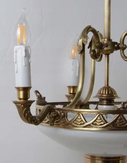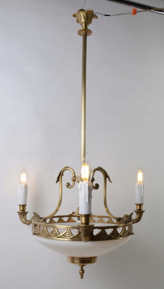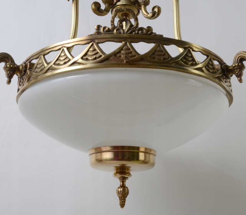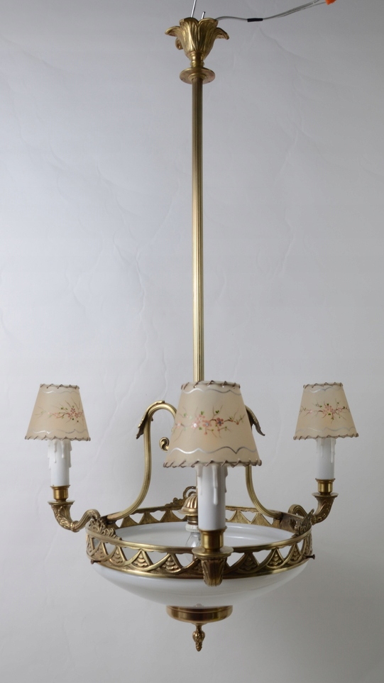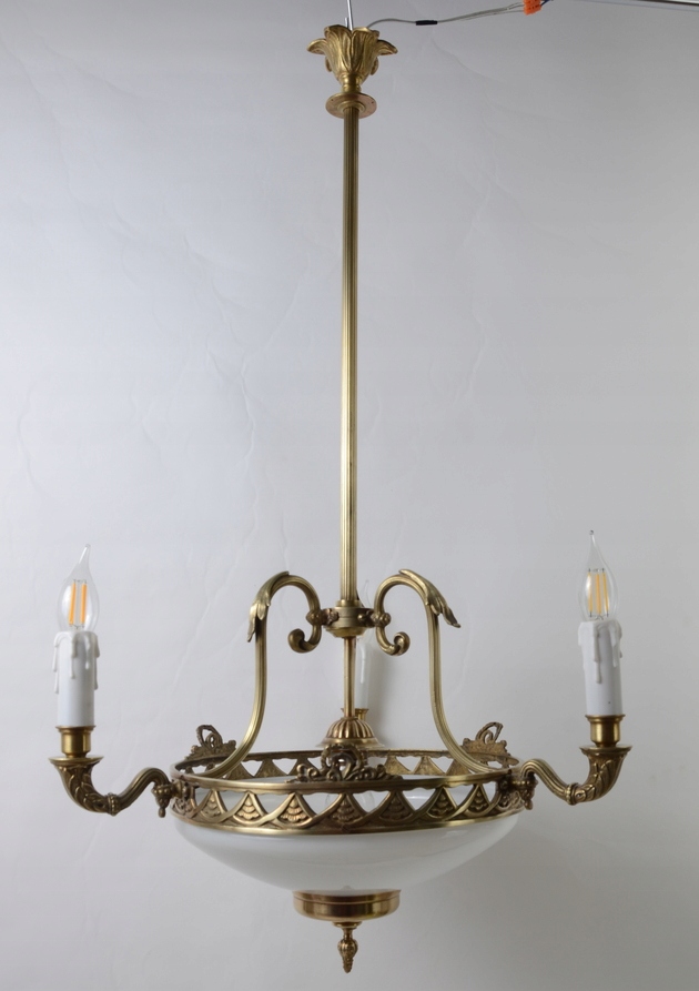 Він виготовлений із бронзи золотого кольору. Люстра чудово різьблена з трьома точно вигнутими плечима, які закінчуються свічником, що виходить із центру. Лампа має довгу пряму штангу з кришкою. Виріб також має білий абажур, розташований на ободі знизу, який, як і стельовий світильник, додатково пропускає світло через кімнату.