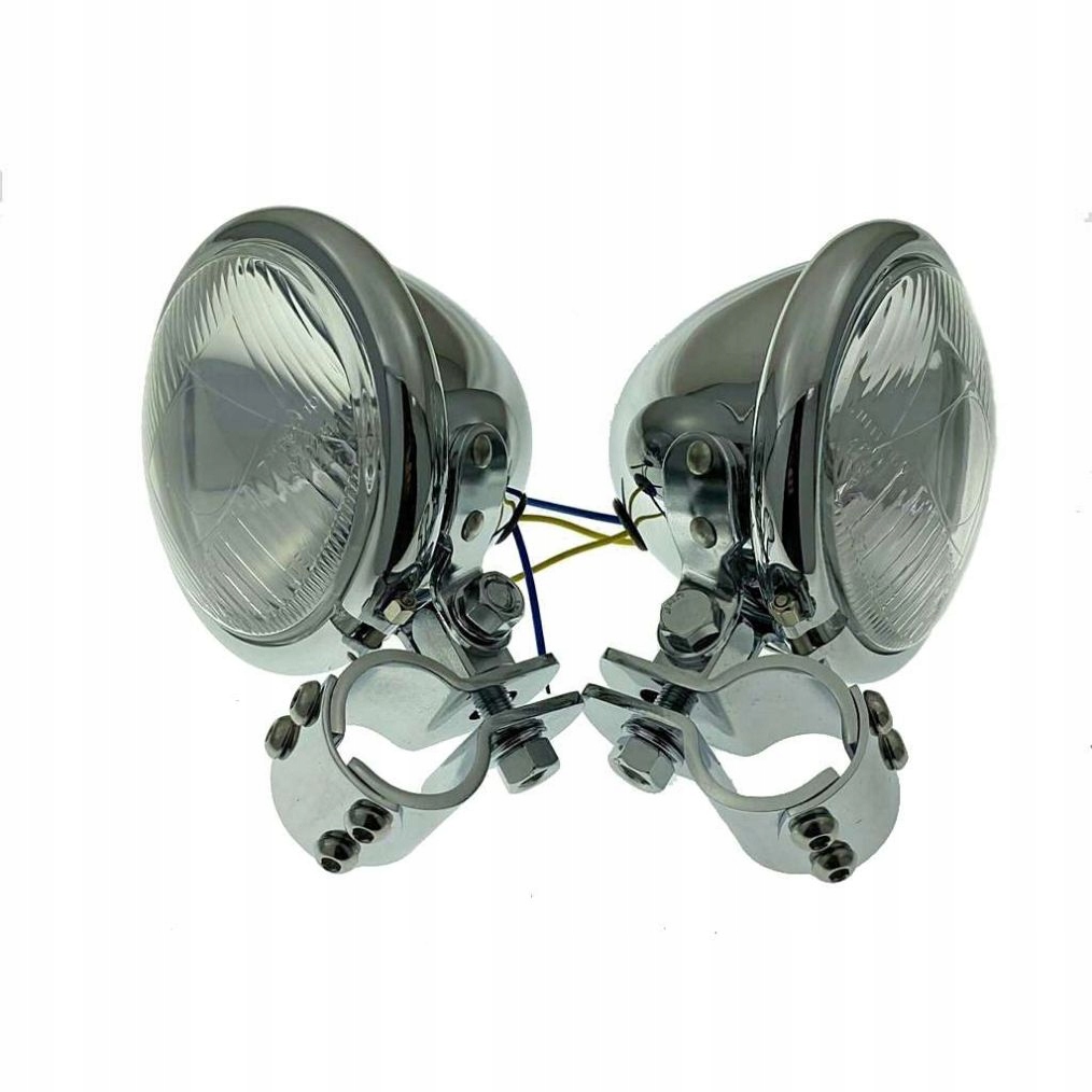 - Лампи та затискачі хромовані. Вони оснащені лампочками H3 12V 55W і синім індикатором, який вказує на те, що лампи увімкнені. Вони мають європейське схвалення. Хомути дуже міцні, кріпляться з трьох частин. Набір дозволяє монтувати ліхтарі на передню дугу і регулювати кут падіння світла.