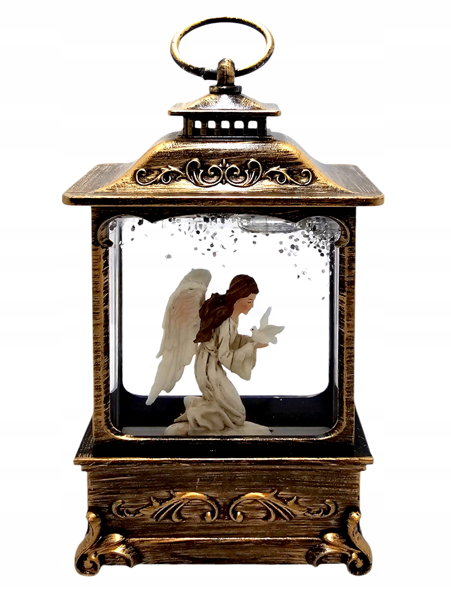 ліхтар, заввишки близько 14 см і шириною 8 см, ідеально підходить куди завгодно. Його житло було ретельно забарвлене на елегантному, витертим золотом, надаючи йому старовинний стиль. За прозорим склом - прекрасна, коліна статуетка ангела з голубом у руках. Фігура ангела розміщена у воді, просто струшуйте ліхтар, щоб срібний блиск почав крутитися, створюючи магічний, блискучий ефект.