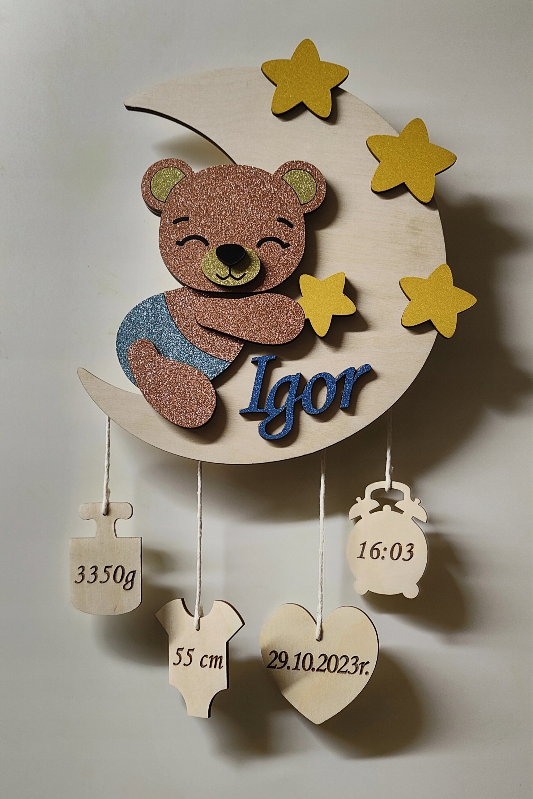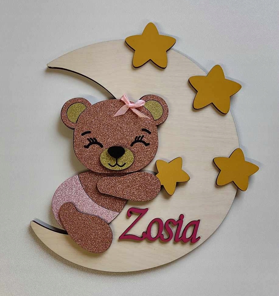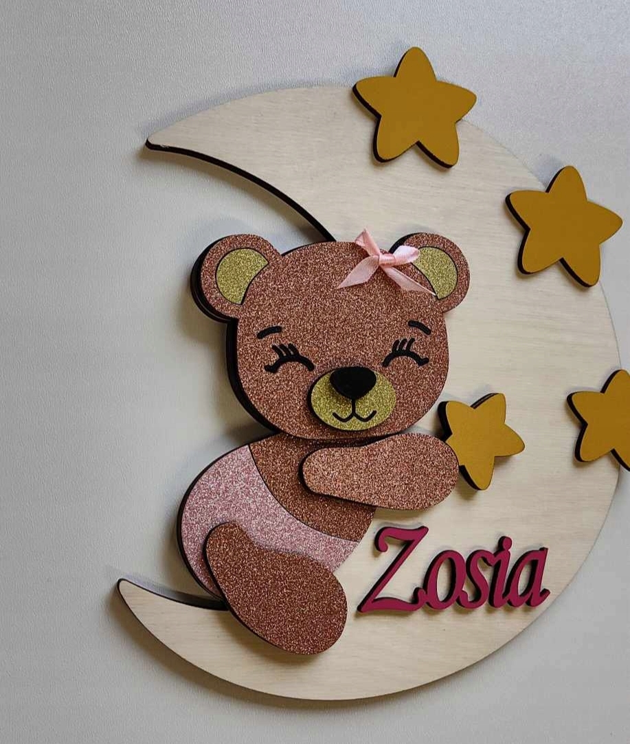 Lampka nocna misio śpiący na księżycu imienna metryczka brokatowa sklejka