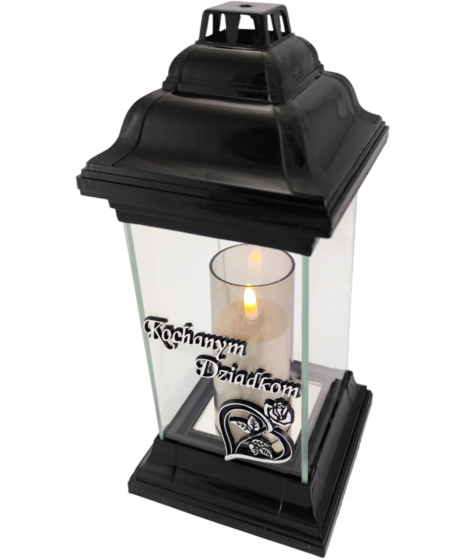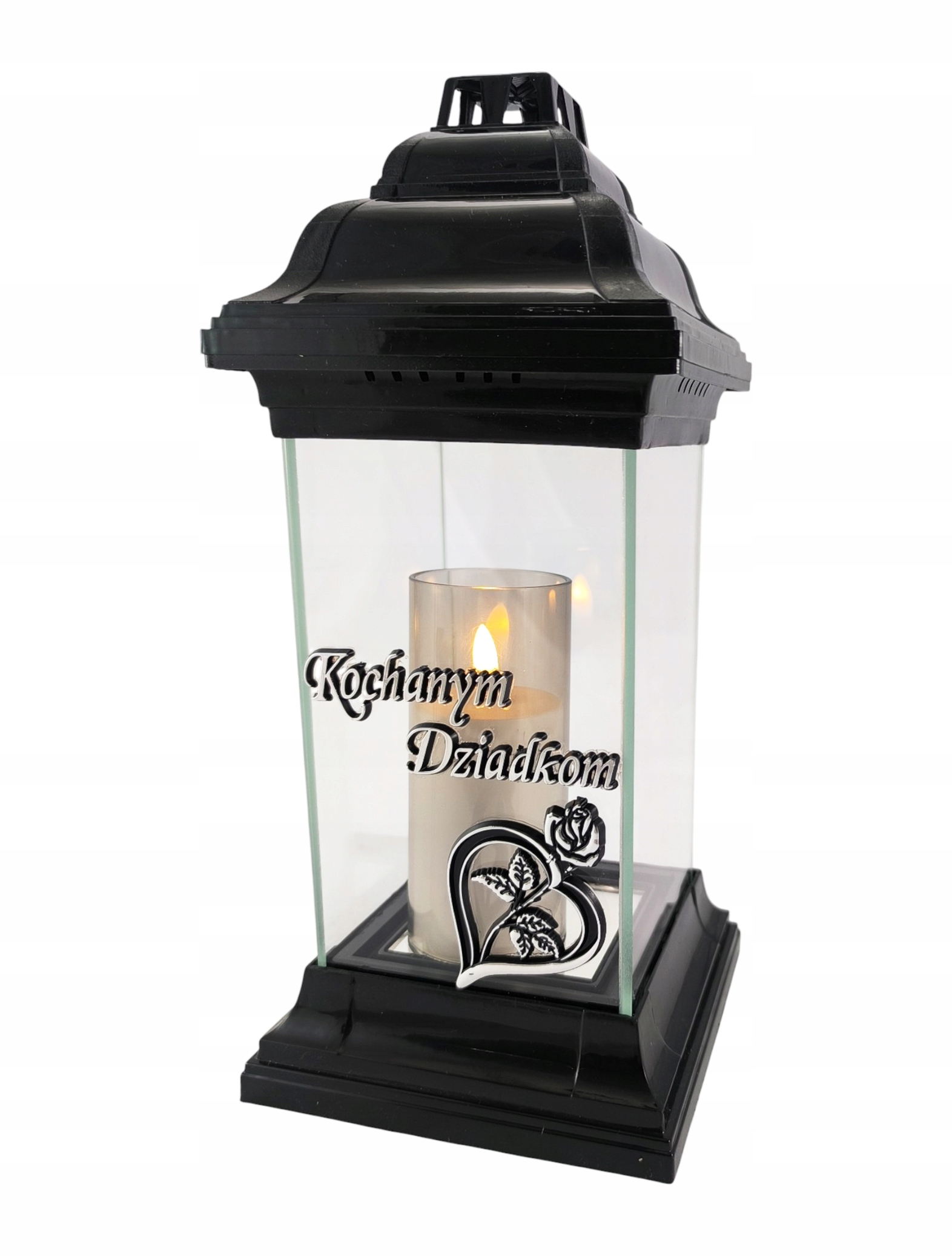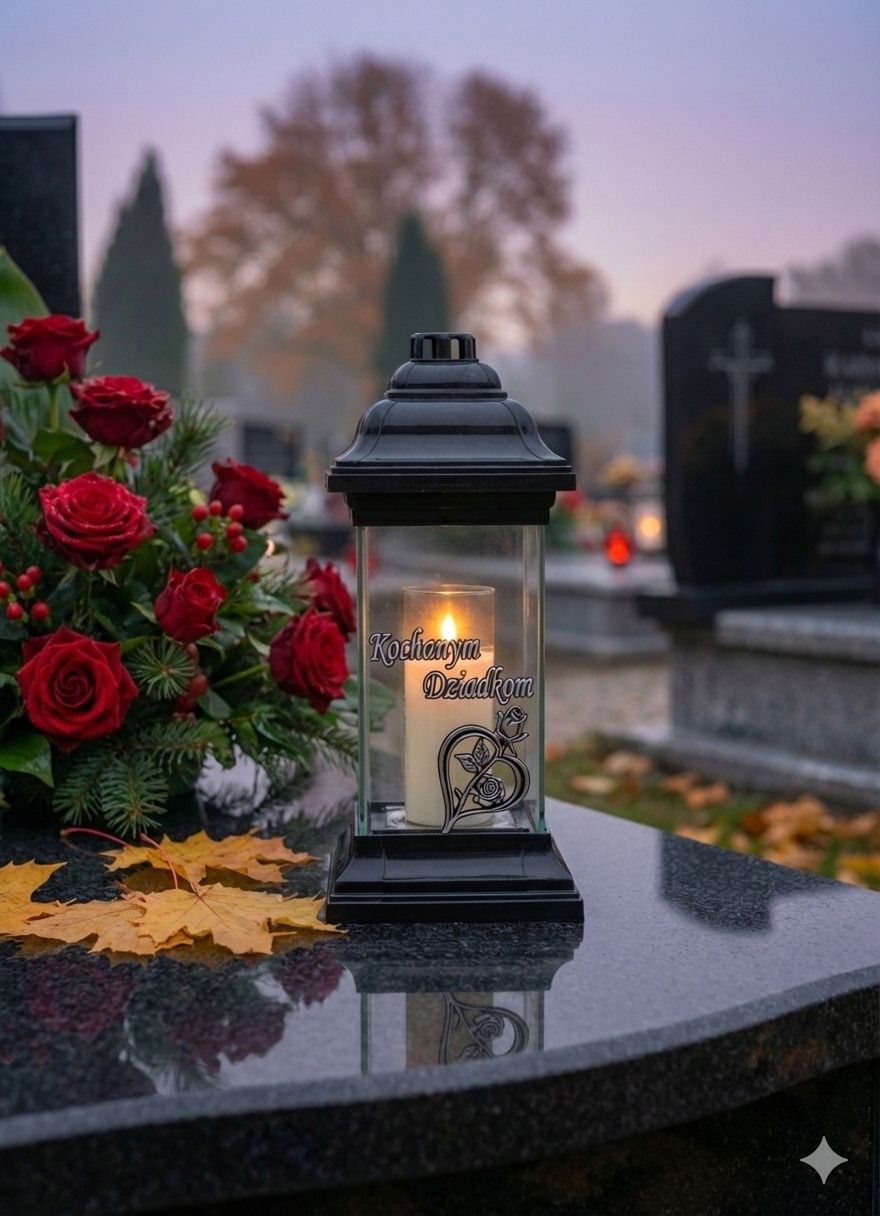 Святочка виготовлена з товстого безбарвного скла. Посередині келиха сріблястий напис Дорогим бабусям і дідусям. Під написом — мотив сердечка, в якому переплетена троянда, що символізує любов і пам'ять. Ліхтарик важкий, міцний, а широка основа забезпечує стійкість. Ліхтар має широкий отвір для вставки діаметром 7,5 см, тому він адаптований до багатьох розмірів парафінових і масляних вставок і різних типів фігурок і світлодіодних вставок.