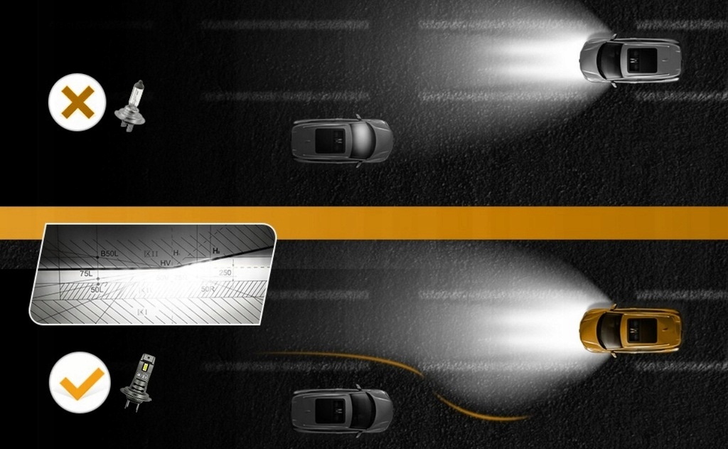 Оскільки вольфрамові волокна, що використовуються в стандартних галогенних цибулах, освітлюються точно посередині цибулин, вони забезпечують ідеальний малюнок світла та необхідний розріз у прожектора, призначені для них, відображаючи точно посередині відбивача лампи. Світлодіодні лампочки