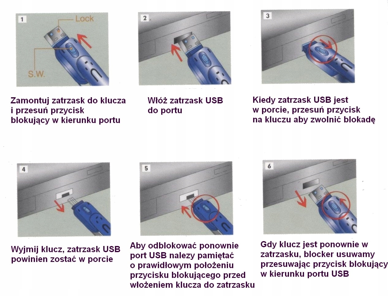 , що безпосередньо підключують порт USB. Щоб використовувати блокатор, просто підключіть замок до порту USB і відпустіть засувку, а блокатор залишиться в порту. Щоб видалити блокатор, просто підключіть клавішу, щоб видалити замок.
