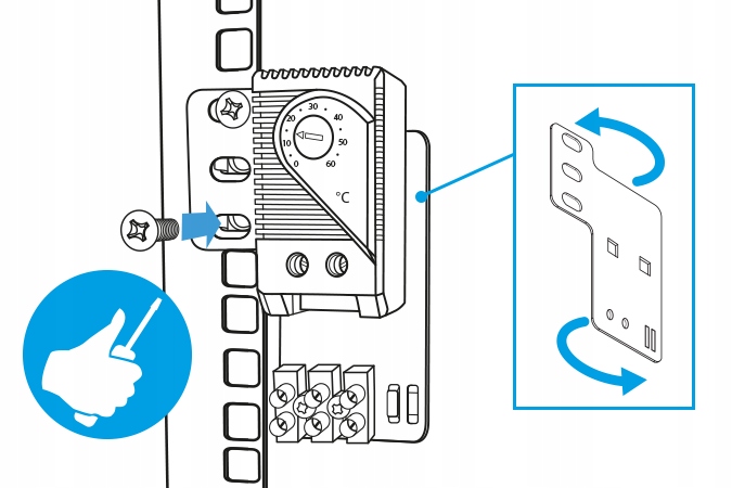 також можна повернути на 180 градусів і закріпити в місцях, де є проблема зі стандартним простором стійки. Крім того, у вусі є отвори з обох боків, що дозволяє двосторонній установку термостата на ньому.