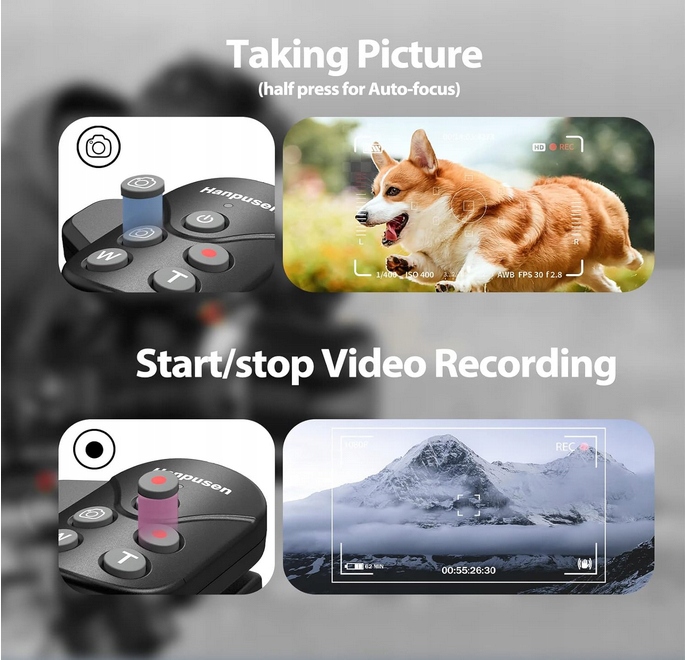 - Пульт дистанційного керування масштабуванням: цей контролер масштабування камери підтримує зйомку однієї фотографії, початок/зупинку запису, автофокусування (натисненням кнопки спуску затвора наполовину), змінну швидкість зменшення/збільшення масштабу (половина натискання повільно, повне натискання швидко)